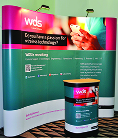 3m * 3m portable display. Back drop stands for exhibitions and events. Including a frame, two spot lights, baeling sheet and a wheeled case.